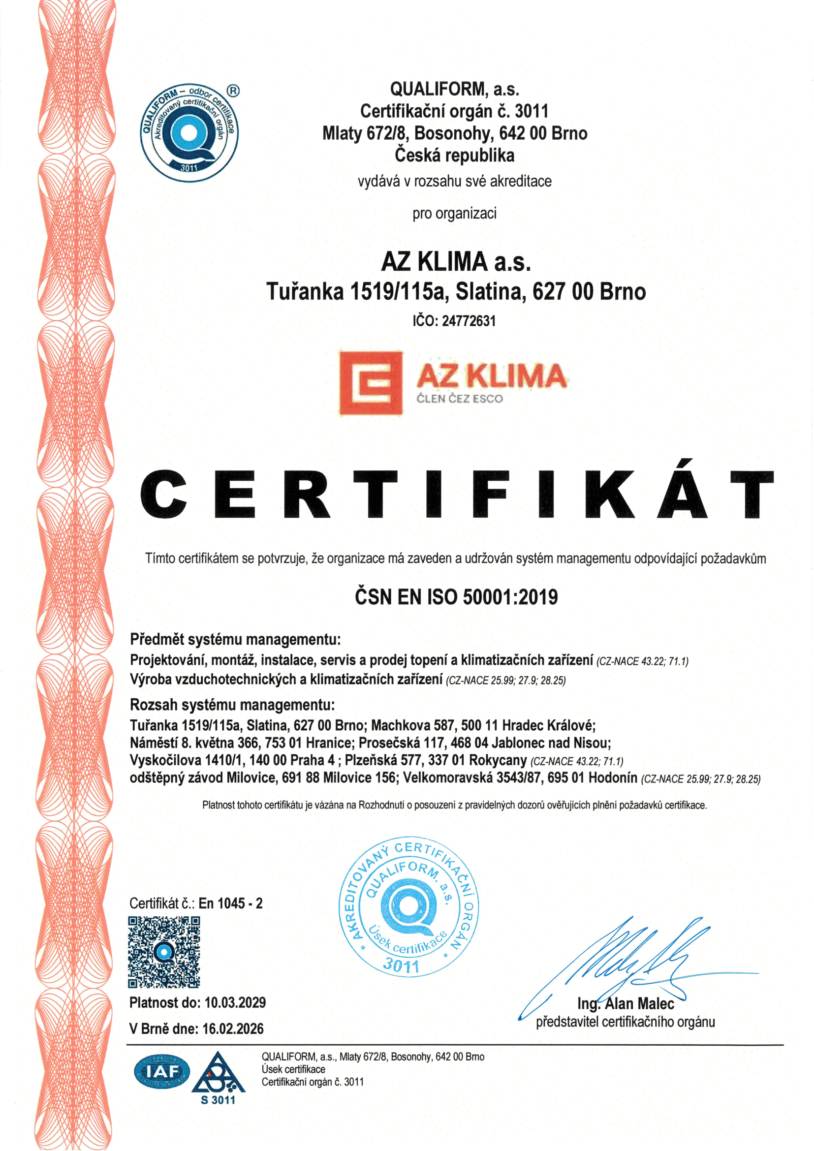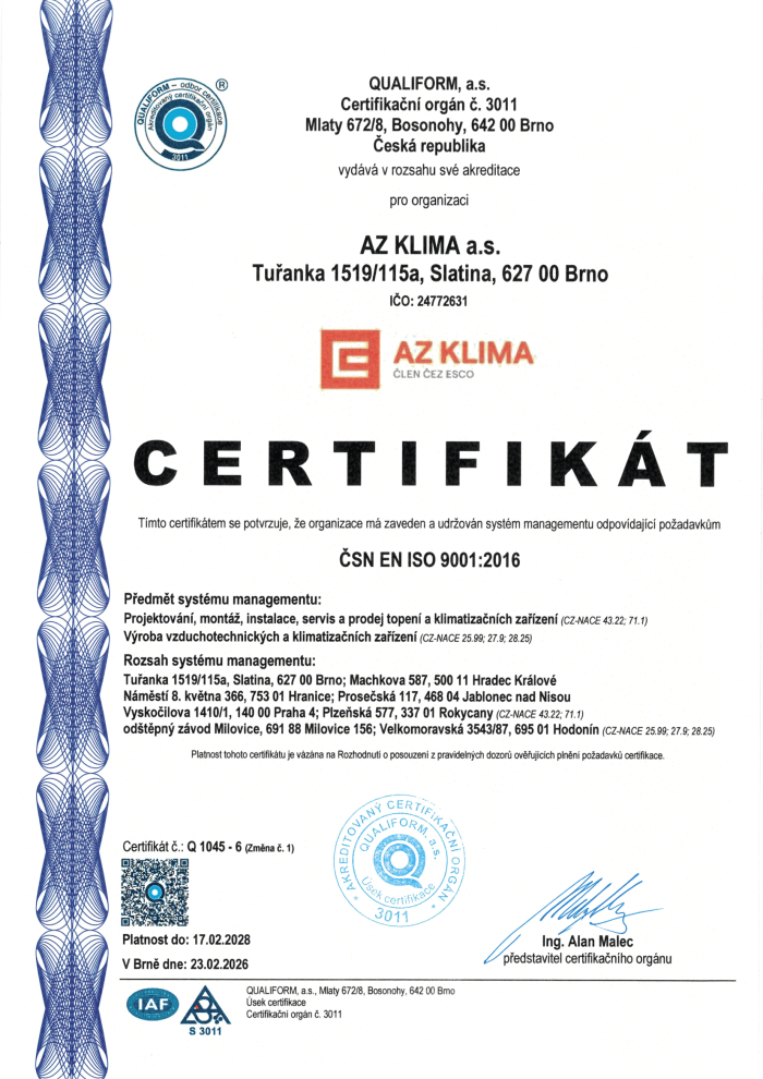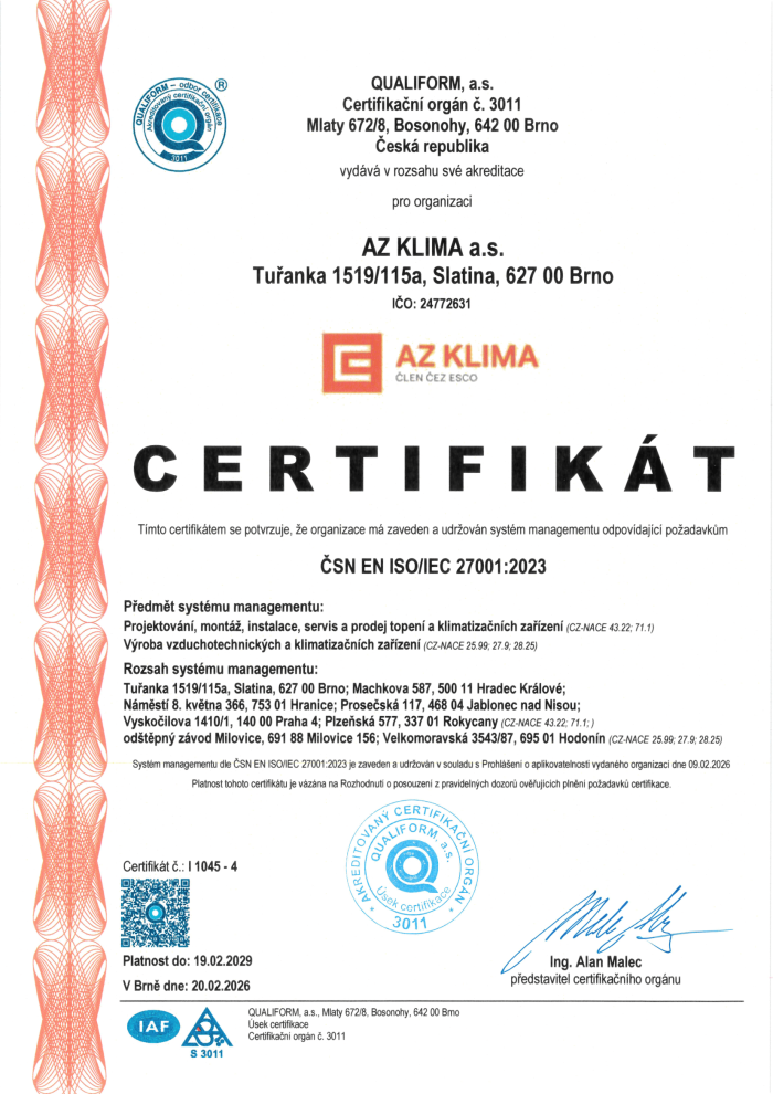 Společnost AZ KLIMA a.s. má zaveden a certifikován systém integrovaného managementu (IMS).